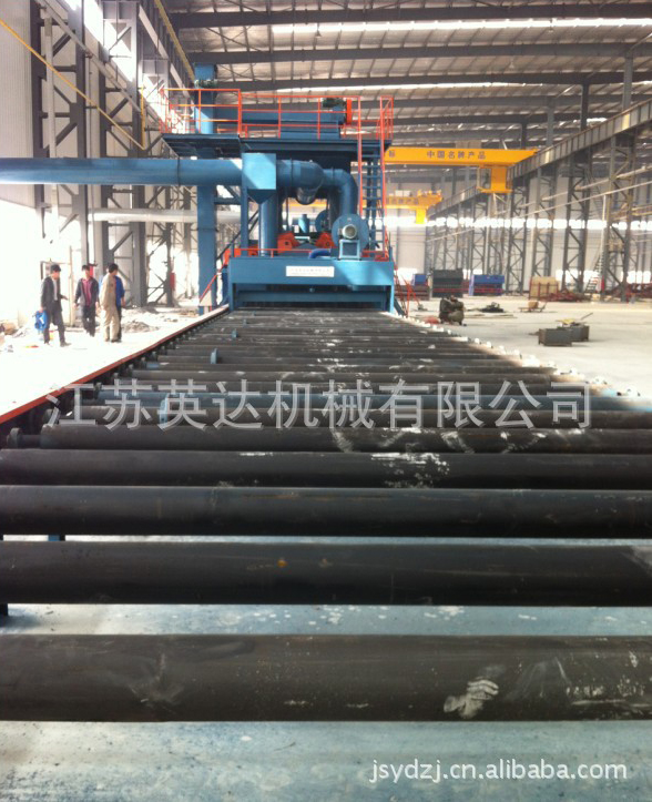 主要由輥道輸送系統、拋丸清理機、拋丸除塵系統、和電控系統所組成。其工作原理是:由輸送輥道送至封閉的拋丸清理室,,利用拋丸器高速旋轉的葉輪將鋼絲切丸(彈丸)加速拋射至工件表面,對工件表面進行沖擊、刮削以清除工件表面的鐵銹和污物,然后利用橫掃、滾刷、收丸螺旋和高壓吹管將工件表面的積丸和浮塵吹掃干凈,由送出輥道送出,從而使鋼材達到除銹、防銹的目的。